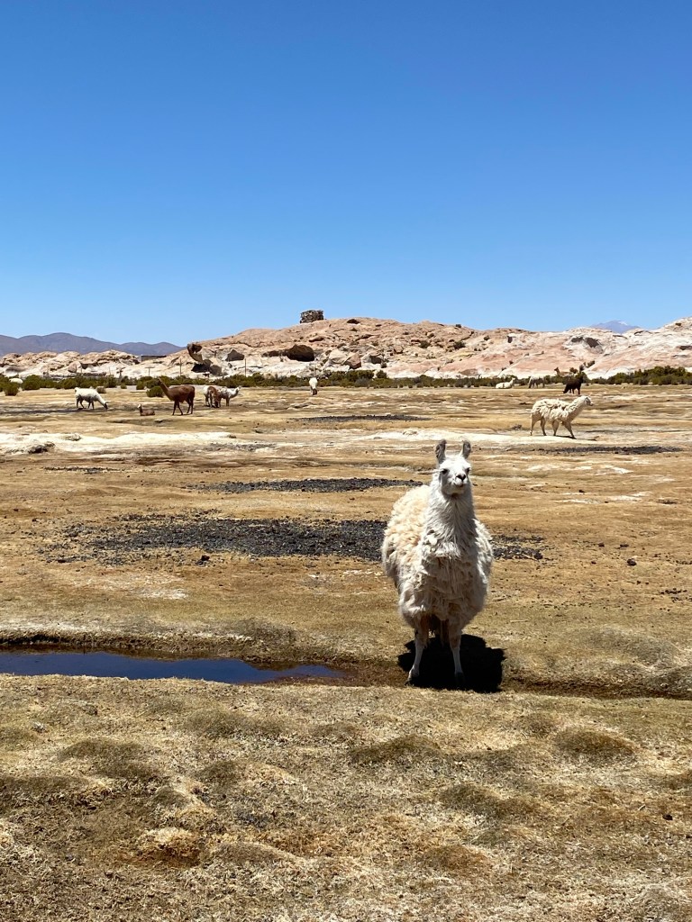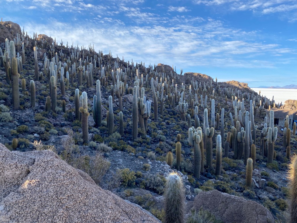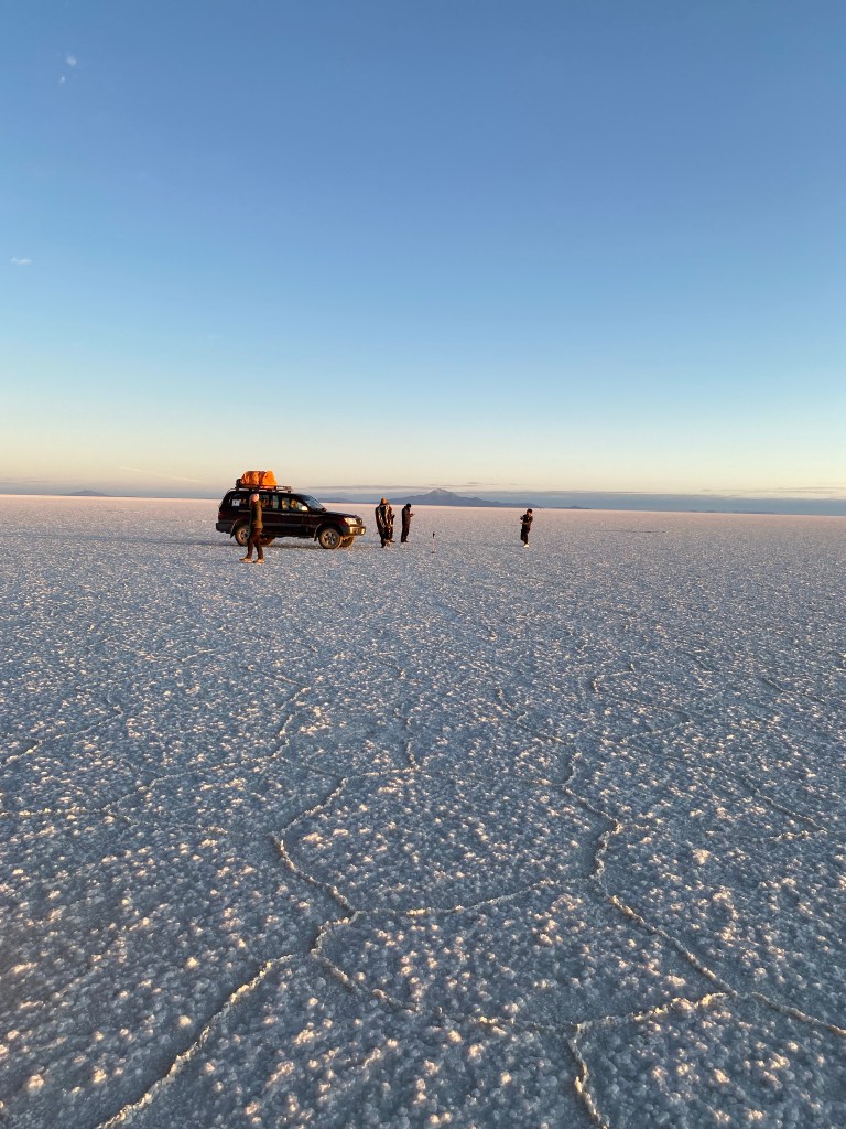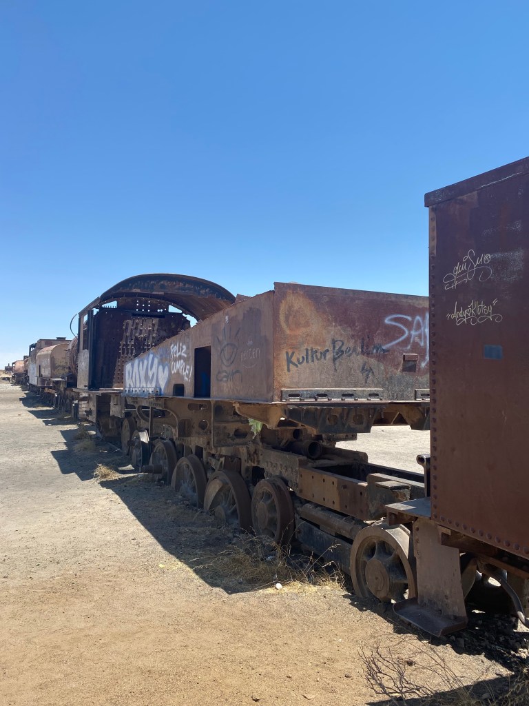 Der heutige Tag startet relativ früh. Da wir in den Tag mehrheitlich im Auto verbringen und nur sehr beschränkt Platz haben, deponieren wir unsere Rücksäcke hier im Hotel und nehmen nur das Nötigste in einer Tasche mit. Ich hoffe wir haben auch genügend Wasser und Snacks dabei. Um kurz nach 7:00 Uhr werden wir schliesslich mit einem Minibus abgeholt und fahren zur chilenischen Grenzkontrolle. Nach knapp einer Stunde sind wir bereits dort und holen uns den Ausreisestempel. Mir wird währenddessen übel und total schwindlig. Unser Fahrer erklärt uns, dass wir in der letzten Stunde knapp 1500 Höhenmeter gemacht haben und wir die Sache langsam angehen sollen. Nach weiteren 5 Minuten kommen wir schliesslich bei der bolivianischen Grenzkontrolle an. Die Grenzkontrolle besteht aus einem kleinen, halb auseinanderfallenden Häuschen. Nachdem unsere Einreise genehmigt wurde, essen wir zusammen Frühstück. Hätten wir das gewusst, wären wir nicht extra früher aufgestanden, um in unserer Unterkunft noch etwas zu essen. Aber egal, wir freuen uns riesig und sind gespannt auf die nächsten Tage. Unsere Gruppe, mit welcher wir die nächsten Tage im Auto sitzen, bestehen nebst uns aus der Franzosin Clémentine, dem US-Amerikaner X (ja, er nennt sich wirklich so) und Nicole sowie Jonathan, einem Paar aus Brasilien. Nach dem Frühstück kommt unser Guide/Fahrer Nelson an. Nelson ist aus Bolivien und lebt in Uyuni. Am heutigen Tag besuchen wir die Lagunen „Laguna blanca“ und „Laguna verde“, die Dali-Wüste und ein Geysirfeld. Dann halten wir beim Thermalbecken „Termas de Polques“ bei welchem man sich bei knapp 30 Grad warmen Wasser aufwärmen kann. In einem der Häuser nebenan, essen wir dann zu Mittag. Am Nachmittag besuchen wir noch die „Laguna colorado“ welche rot gefärbt ist und wo wir unglaublich viele Flamingos und ein paar Vicuñas beobachten können. Das Wetter ist hier ziemlich unberechenbar. Die Sonne scheint zwar intensiv, aber da wir uns auf über 4‘000 Höhenmeter befinden und es stark windet, trage ich mehrere Schichten Kleidung. Um etwa 18:00 Uhr kommen wir in unserer heutigen Unterkunft an. Ein sehr einfaches, schlichtes Haus ohne Heizung. Nach dem Abendessen schlüpfen wir unter die Decke und frieren erstmal. Nachts wird es brutal kalt. Irgendwann gewinnt aber die Müdigkeit und wir schaffen es doch einzuschlafen. Am nächsten Morgen geht es nach dem Frühstück weiter zu „Italia Perdida“, wo man Felsen in einzigartigen Formationen findet. Durch Wind und Niederschläge wurden diese über die letzten Jahrhunderte so geformt. Dann fahren wir zu zwei weiteren Lagunen, wo wir eine Herde Lamas antreffen. Nach dem Mittagessen fahren wir zum „Canyon Anaconda“, also der Anakonda Schlucht. Schwierig zu sagen, wem diese Schlucht wohl ähnelt… Nach einem weiteren aber kurzen Stopp bei einem kleinen Laden, endet der Tag bei unser heutigen Unterkunft. Heute übernachten wir in einem Salzhotel, von wo wir bereits eine mega Aussicht über den Salzsee „Salar de Uyuni“ haben. Das eigentliche Highlight unserer mehrtägigen Tour. Hier ist es noch kälter als letzte Nacht. Wir schlafen schlussendlich mit etwa 3 Schichten Hosen, 4 Schichten Oberteilen, dicken Socken und Handschuhen. Irgendwann klappt’s dann zum Glück auch mit dem Einschlafen. Nach einer kurzen Nacht geht es dann um etwa 4:00 Uhr los in Richtung Salar. Dort halten wir schliesslich an und beobachten über eine Stunde lang den Sonnenaufgang. Es ist unglaublich schön und wirklich unfassbar. Der Salar war früher ein riesiger See, der austrocknete und das Salz hinterliess. Der Salar ist etwas über 10’500 Quadratkilometer gross und ca. 120 Meter tief. Während der Regenzeit, also um Dezember bis Januar, bildet sich eine Wasserschicht über dem Salz, was dann wie ein riesiger Spiegel aussieht. Da gerade aber keine Regenzeit ist, ist der Salzsee trocken. Nun geht es weiter zur „Isla Incahuasi“. Auf dieser Erhebung, mitten im Salar, findet man unzählige jahrhundertalte Kakteen. Einige davon sogar bis zu zehn Meter hoch. Auf mich wirkt diese Insel einfach surreal. Nach einem kleinen Rundgang auf der Insel, essen wir dort zusammen Frühstück. Dann geht es zurück auf den Salar, wo wir Zeit haben Fotos zu machen. Nachdem wir alle fertig sind, fahren wir weiter. Nach ein paar weiteren kurzen Stopps für Souvenirs oder WC-Pausen, kommen wir schliesslich in Uyuni an. Vor dem Mittagessen, schauen wir uns noch den Eisenbahnfriedhof in Uyuni an. Dieser gilt als der grösster solcher „Friedhöfe“ weltweit. Danach geniessen wir das letzte gemeinsame Mittagessen. Nelson fährt uns später zum Agenturbüro in Uyuni und verabschiedet sich. Wir verbringen zusammen noch eine Stunde in Uyuni und besuchen einen lokalen Markt. Dann verabschieden wir uns von Clémentine, Nicole und Jonathan. Mit X und einer weiteren Franzosin, welche aus einer anderen Gruppe zu uns kommt, fahren wir nun mit einem neuen Fahrer zurück in Richtung San Pedro de Atacama. Abends übernachten wir nochmals in der Unterkunft, wo wir in der ersten Nacht übernachtet haben. Frühmorgens geht es dann weiter zur Grenze zurück nach Chile. Nach dem Frühstück an der bolivianischen Grenze, fahren wir wieder in einem Minibus zurück nach San Pedro de Atacama. Um Mittag treffen wir bereits wieder in unserem Hotel in San Pedro ein. Nach einer kurzer Erholungspause gehen wir abends im Zentrum etwas Essen und um 20:00 Uhr beginnt unsere Astronomietour. Wir fahren mit einem kleinen Bus ca. 20 Minuten aus San Pedro. Dort steigen wir alle aus und setzen uns auf Holzbänke. Unterdessen ist es pechschwarz um uns und wenn man hoch zum Himmel schaut, entdeckt man die Milchstrasse über unseren Köpfen. In den nächsten zwei Stunden werden uns verschiedene Sterne, sowie auch der Jupiter und Saturn gezeigt. Dabei können wir verschiedene Teleskope benutzen. Im Anschluss an die Tour fallen wir müde ins Bett. Die letzten Tage waren für uns beide ein absolu